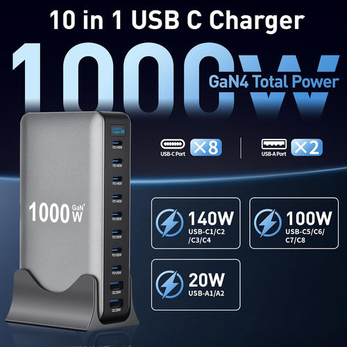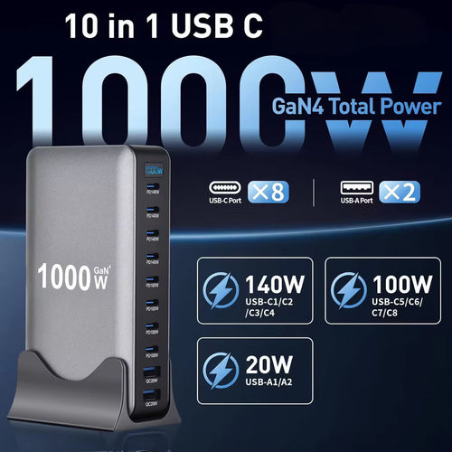 1000W GaN PD3.1 Charger USB-C Fast Desktop 10-ports